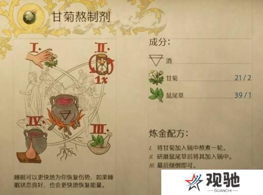 天国拯救2游戏中有许多药剂需要炼制,很多玩家不知道甘菊熬制剂怎么炼制,快来和本站一起看看,甘菊熬制剂配方炼制方法吧。更多推荐:《天国拯救2》炼金配方大全天国拯救2甘菊熬制剂配方:一、成分:酒、2个甘菊