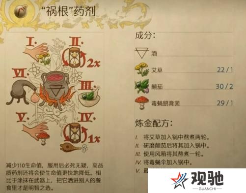 天国拯救2游戏中有许多药剂需要炼制,很多玩家不知道祸根药剂怎么炼制,快来和本站一起看看,祸根药剂配方炼制方法吧。更多推荐:《天国拯救2》炼金配方大全天国拯救2祸根药剂配方:一、成分:酒、1个艾草、2个