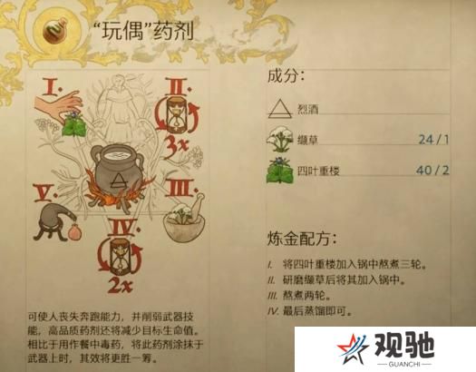 天国拯救2游戏中有许多药剂需要炼制,很多玩家不知道玩偶药剂怎么炼制,快来和本站一起看看,玩偶药剂配方炼制方法吧。更多推荐:《天国拯救2》炼金配方大全天国拯救2玩偶药剂配方:一、成分:烈酒、1个缬草、2