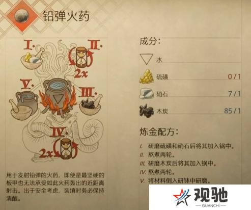 天国拯救2游戏中有许多药剂需要炼制,很多玩家不知道铅弹火药怎么炼制,快来和本站一起看看,铅弹火药配方炼制方法吧。更多推荐:《天国拯救2》炼金配方大全天国拯救2铅弹火药配方:一、成分:水、硫磺、1个石、