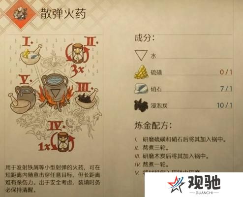 天国拯救2游戏中有许多药剂需要炼制,很多玩家不知道散弹火药怎么炼制,快来和本站一起看看,散弹火药配方炼制方法吧。更多推荐:《天国拯救2》炼金配方大全天国拯救2散弹火药配方:一、成分:水、硫磺、1个石、