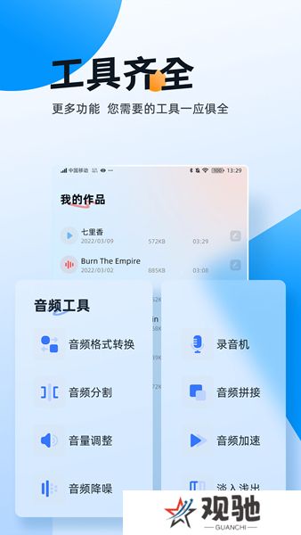 2、工具齐全:提供音频混合、剪辑、加速、降噪等多种功能。